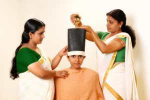 This is a procedure of keeping the medicated oil or ghee on the head, 2 inches above the level of hair.